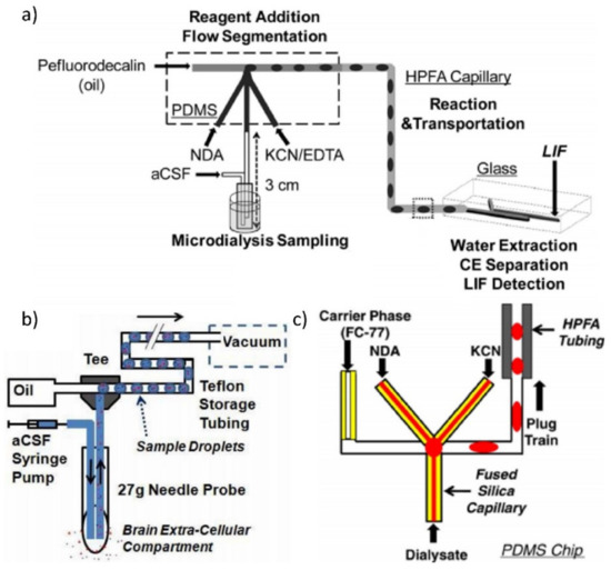 A modern trend is to apply microdialysis in various clinical situations, such as monitoring concentrations of glucose, lactate, glutamate, and urea [84]. The microdialysis probe makes it possible for sampling to be done frequently without any loss of the volume from the tissue. Figure 2a shows a microdialysis probe coupled to a droplet generation chip to transport chemical signals to a distant capillary electrophoresis system [11,85]. The device has been used for sampling of neurotransmitter signals in a rat brain [86]. It has also been applied to an immobile live animal [87].