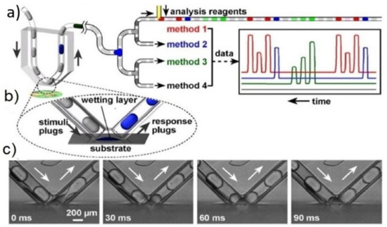 It is reported that temporal resolution for conventional high-performance liquid chromatography (HPLC) is minutes [31]. Such time scales make it impossible to quantify analyte concentrations that change rapidly accurately. Droplet-based approaches can be used to effectively avoid dispersion and improve temporal resolution by capturing and storing events that occur too quickly for a particular analytical method [32,33,34,35,36,37]. Microdialysis sampling, coupled with droplets and direct infusion mass spectrometry was used for acetylcholine monitoring [38] with intervals of just a few seconds. Monitoring of real-time streptavidin–biotin binding kinetics was also achieved using droplet microfluidics integrated with confocal spectroscopy [39]. Srinivasan et al. [40] reported the integration of optical absorbance measurements with droplet-based microfluidics for the detection of glucose using glucose oxidase in less than 40 s. The coupling of a digital droplet-based microfluidic device to surface plasmon resonance (SPR) imaging has also been demonstrated [41,42].