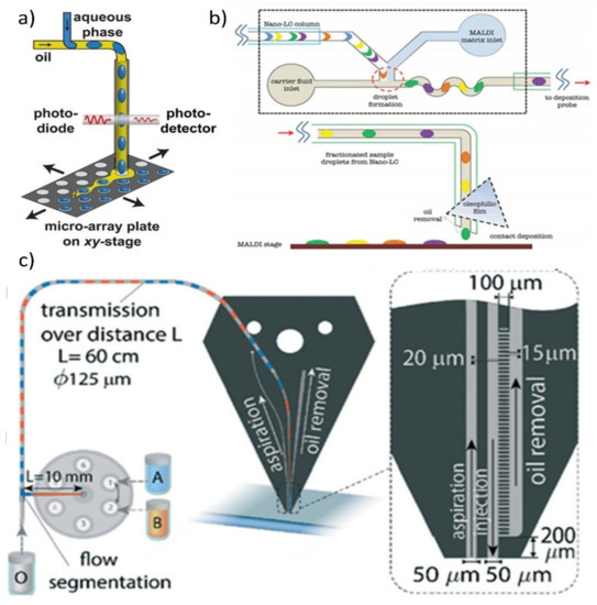 The oil phase can be absorbed by an oleophilic and hydrophobic membrane. Figure 5b shows that an oleophilic membrane made of Polytetrafluoroethylene (PTFE) was used to absorb and extract the continuous phase [106]. The aqueous phase was left suspended and placed one drop at a time on the hydrophilic part of a MALDI plate.