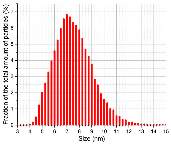 Particle size measurements are shown in Figure 1. The histogram demonstrates how the majority of aggregates (94.4%) vary in size in the range of 4 to 10 nm, with most (54%) of the C60 aggregates having a size from 6 to 8 nm; only 3.9% of aggregates have smaller diameters up to 5 nm. Resulting mean size is approximately 2–4 times larger than supernatant aggregates obtained in [27]. It was necessary to make sure that the deviation in cluster sizes was small enough because fullerenes can have different properties, e.g., in [27], larger aggregate size was found to be associated with lower antibacterial activity. Besides, according to [28], size of C60 aggregates and solution concentration may be dependent.