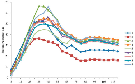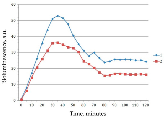 The strain E. coli MG1655 (pKatG-lux) contains a hybrid plasmid into which the regulatory region (promoter and operator) is inserted, with the reporter gene lux-CDABE being isolated from the genomes of luminous bacteria. The PKatG promoter detects hydrogen peroxide down to a concentration of 5 × 10−6 mol/L, while the concentration of hydrogen peroxide causing the highest bioluminescence induction is equal to 10−3 mol/L. The lux AB genes encode the synthesis of luciferase subunits, lux-CDE reductase synthesis. The reductase is involved in the formation of the substrate luciferase—tetradecanal. Lucerase catalyzes the oxidation of tetradecanal with the emission of a photon of blue-green light (λmax = 490 nm), which was detected by a luminometer. Integration time to record a response (significant bioluminescence increase) at such wavelength in the presence of H2O2 was equal to 30 min, which is in accordance with the range reported in literature: 5–20 min [22,23].