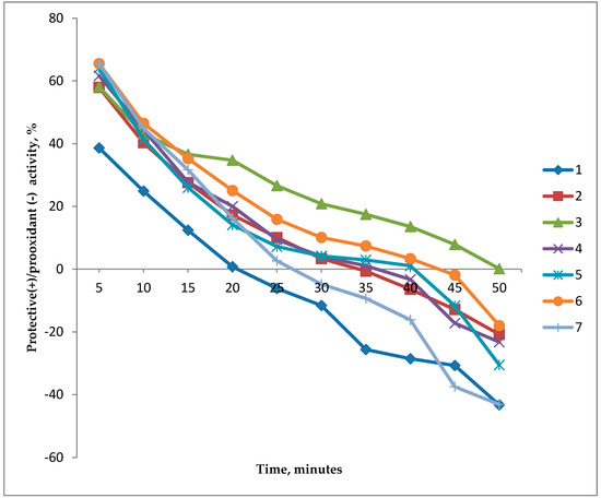 Comparative dynamics of the protective and prooxidant effects of C60, measured between 5 and 50 min after beginning of the experiment, %. 1: Fullerene C60 in a concentration of 10−15 g/L; 2: C60 10−12 g/L; 3: C60 10−9 g/L; 4: C60 10−6 g/L; 5: C60 10−5 g/L; 6: C60 10−4 g/L; 7: C60 10−3 g/L.