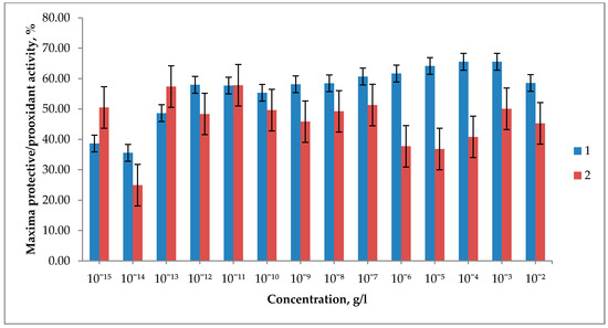 Maximum protective (1) and prooxidant (2) effect of the C60 solution in TWEEN 80 2% of different concentrations.