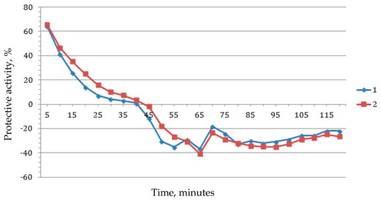 Protective effect time dependency for C60 in TWEEN 80 2% at concentrations 10−5 (1) and 10−4 (2) g/L.