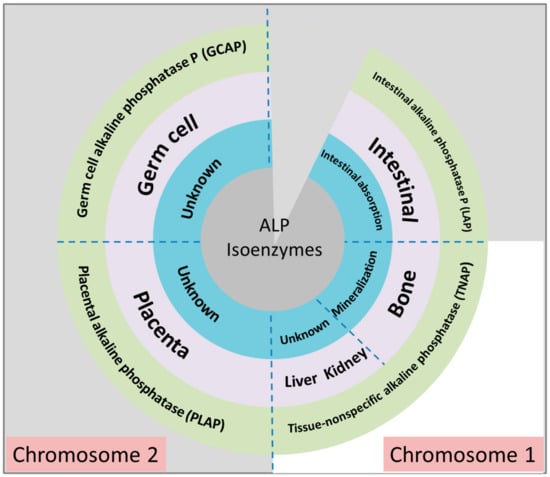Mammalian ALPs are present as different isoenzymes. Figure 2 shows the main four isoenzymes of ALP, which are germ cell alkaline phosphatase (GCAP), intestinal alkaline phosphatase (IAP), placental alkaline phosphatase (PLAP) and tissue-nonspecific alkaline phosphatase (TNAP). GCAP, IAP and PALP, are located in chromosome 2, whereas TNAP is located in chromosome 1—all of which their precise physiological and neoplastic functions are unknown. However, TNAP was found to be responsible for calcification in bone and concern regarding regulating the secretory activities in liver, but as mentioned earlier their main function still unidentified. ALP isoenzyme can be referred to as a biomarker for cancer before a tumor is formed. Fishman (1980) contends that PLAP is sometimes found in individuals with ulcerative colitis or polyposis of the colon, and it is through this that they enhance the capability of acquiring cancer [17]. Bukowczan et al. also examined that PLAP has a relationship with different tumors such as renal cell carcinoma (RCC) [18].