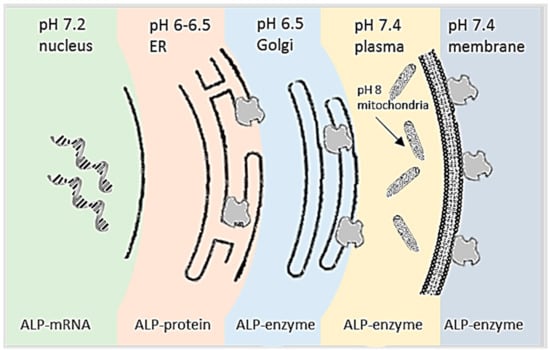 There are many expression systems for proteins including mammalian cell, bacteria and yeast. Among them, mammalian cells help in the folding of proteins, post-translational modifications and product assembly, which all are important in harnessing mammalian cells for protein production [24]. In addition, mammalian cells have proved to be well suited with an efficient expression system that leads to good productivity due to containing glycosylation, which is required for secretion and stability. However, a mammalian cell is more complex and costlier than other expression systems such as bacteria and yeast. ALP is located in the membrane of mammalian cells and is found to be in periplasmic space of E. coli bacteria [2]. Figure 3 shows that ALP is made in the nucleus. Then formed to protein in endoplasmic reticulum (ER) and in Golgi body formed as an iosenzymes. These processes are all under natural pH. ALP is then bonded to a cell membrane where the pH is 7.5. This pH does not allow ALP to induce unless the environment surrounding it rises to an alkaline pH. For example, during cell metabolism or necrosis inflammation where HCO3- raises causes an increment of alkalinity in the cell membrane, thus activating ALP [25].