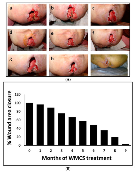 (A) (a–i): Serial photography of the clinical outcome of Patient 1 after WMCS treatment. (B) Presentation of photographic wound closure percentage of Patient 1. Wound healing is expressed as percentage wound area closure relative to original size [(wound area)/(original wound area)].