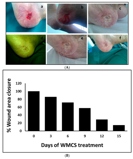 (A) (a–f): Serial photography of the clinical outcome of Patient 2 after WMCS treatment. (B) Presentation of the photographic wound closure percentage of Patient 2. Wound healing is expressed as percentage wound area closure relative to original size [(wound area)/(original wound area)].