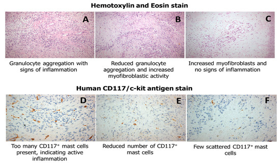 (A–C) Hemotoxylin and Eosin immunohistochemistry of tissue biopsies from Patient 1, demonstrating initial granulation tissue formation and inflammation markers and increased myofibroblastic activity, and (D–F) CD117+ mast cells after WMCS treatment.