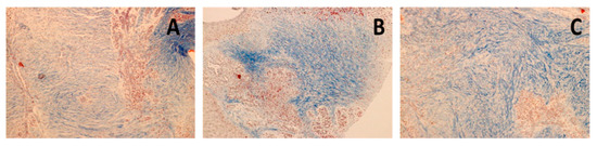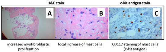 (A–C) Immunohistochemical analysis of tissue biopsies from Patient 2, showing increased myofibroblastic activity, with a relative focal increase of mast cells (H&E stain 5A and 5B, respectively), and c-kit (CD117) antigen stain showing reduced CD117+ mast cells over WMCS treatment (5C).