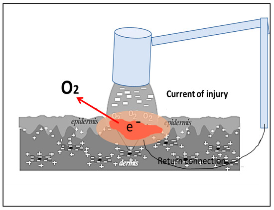 The WMCS device used in this study is a prototype based on a commercially-available model (W200, Wetling, Fredensborg, Denmark), capable of generating tissue currents and voltages as a conventional electrode-based electrostimulation (ES) device. WMCS utilizes the current-carrying capacity of charged air gas, based on the ability of O2 to accept or donate electrons, respectively, thus “spraying” airborne O2− to the skin with the aid of an accelerator equipment. The device used to produce the O2−-induced current in the patient’s body is shown diagrammatically in Scheme 1, in a typical exposure condition. The flow of O2− ions from the device is directed towards the target (i.e., the patient), who is isolated from the ground. The device is capable of producing a specific number of charged particles which are covering the area to be treated and by this way a micro-current of 1.5–4.0 μΑ intensity is generated.
