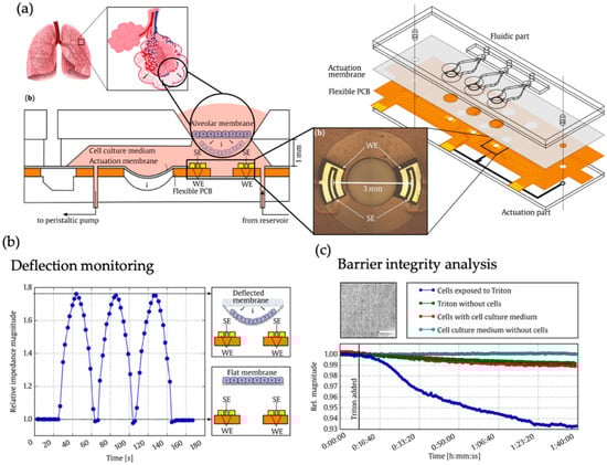 | Lung | Mechanical strain of alveolar barrier during breathing | Human type II alveolar epithelial-like A549 cells (-) | Barrier model | Barrier movement and membrane permeabilization sensing by real-time measurement of resistivity changes in three impedimetric coplanar electrodes. | [45] |