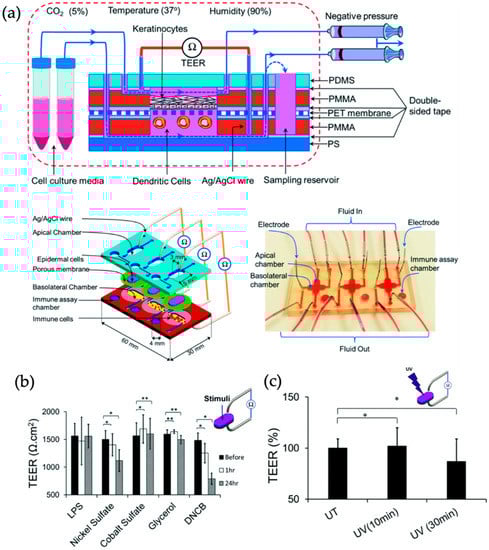 - Henry, O.Y.F.; Villenave, R.; Cronce, M.J.; Leineweber, W.D.; Benz, M.A.; Ingber, D.E. Organs-on-chips with integrated electrodes for trans-epithelial electrical resistance (TEER) measurements of human epithelial barrier function. Lab Chip 2017, 17, 2264–2271. [Google Scholar] [CrossRef] [PubMed]