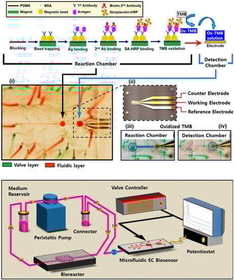 - Riahi, R.; Shaegh, S.A.M.; Ghaderi, M.; Zhang, Y.S.; Shin, S.R.; Aleman, J.; Massa, S.; Kim, D.; Dokmeci, M.R.; Khademhosseini, A. Automated microfluidic platform of bead-based electrochemical immunosensor integrated with bioreactor for continual monitoring of cell secreted biomarkers. Sci. Rep. 2016, 6, 24598. [Google Scholar] [CrossRef] [PubMed]