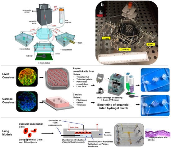 - Skardal, A.; Murphy, S.V.; Devarasetty, M.; Mead, I.; Kang, H.-W.; Seol, Y.-J.; Zhang, Y.S.; Shin, S.-R.; Zhao, L.; Aleman, J. Multi-tissue interactions in an integrated three-tissue organ-on-a-chip platform. Sci. Rep. 2017, 7, 8837. [Google Scholar] [CrossRef] [PubMed]