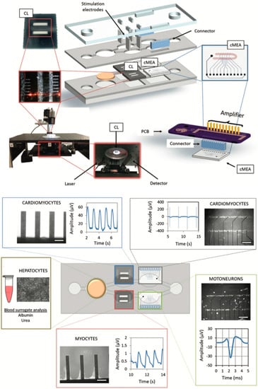 - Oleaga, C.; Lavado, A.; Riu, A.; Rothemund, S.; Carmona-Moran, C.A.; Persaud, K.; Yurko, A.; Lear, J.; Narasimhan, N.S.; Long, C.J.; et al. Long-Term Electrical and Mechanical Function Monitoring of a Human-on-a-Chip System. Adv. Funct. Mater. 2018, 29, 1805792. [Google Scholar] [CrossRef]