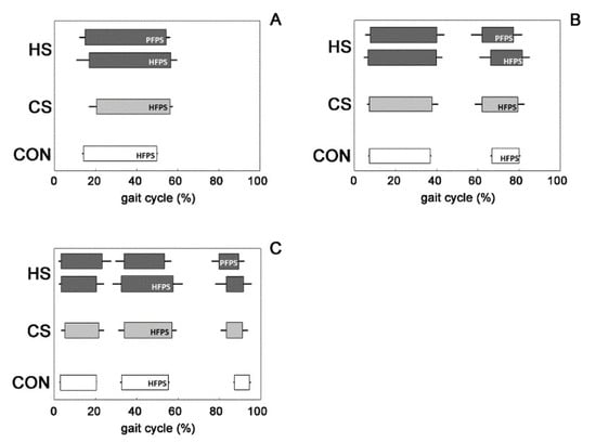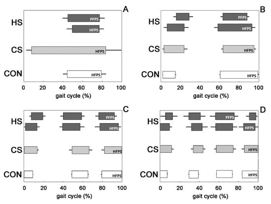 Three main foot-floor contact sequences were detected: HFPS, PFPS, and PS. Their mean percentages were quantified and compared in all three of the groups. For the HFPS sequence, the percentage was significantly (p = 3.10 × 10−7) lower in the HS-group (35 ± 9%) with respect to the CS-group (79 ± 3%) and the CON-group (88 ± 1%). For the PFPS sequence, the percentage was significantly (p = 2.23 × 10−4) higher in the HS-group (44 ± 8%) with respect to the CS-group (8 ± 1%) and the CON-group (5 ± 0.5%). No significant differences (p > 0.05) were detected among groups for the PS sequence: HS-group = 3.0 ± 2.0%, CS-group = 1.0 ± 0.3%, and CON-group = 1.0 ± 0.1%. The CS-group also presented 11 ± 6% of strides with a sequence starting with the P-phase, but different from PFPS and PS. These sequences were negligible in the other groups. Due to the low percentage of their occurrence, data from the PS sequence were not analyzed.
