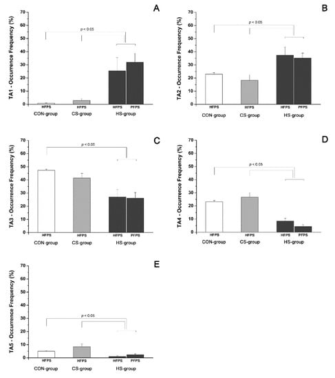 The average occurrence frequencies of muscular recruitment related to all of the detected activation modalities for TA are shown in Figure 3 for the CON-group (white bars), the CS-group (light grey bars), and the HS-group (dark grey bars), respectively. For the HS-group, occurrence frequencies are reported separately for the HFPS and PFPS foot-floor contact sequences. Some significant differences (p < 0.05) in occurrence frequency of TA muscular recruitment were detected among the three groups and are highlighted in Figure 3 by horizontal square brackets. The most frequent modality of activation for TA changed among groups: it was a 2-activation modality both for HFPS (TA2, 37.4 ± 6.1% of total strides) and PFPS (TA2, 35.3 ± 3.8%) sequences of the HS-group and a 3-activation modality for both the CON-group (TA3, 47.3.4 ± 0.8%) and the CS-group (TA3, 41.4 ± 3.5%). A significant increase of the occurrence frequency (for both the HFPS and PFPS sequences) was observed in the HS-group for the modalities TA1 (Figure 3A, p = 2.13 × 10−14) and TA2 (Figure 3B, p = 2.01 × 10−3), compared to both the CON-group and the CS-group. A concomitant significant reduction of the occurrence frequency (for both the HFPS and PFPS sequences) was observed in the HS-group compared to (1) the CON-group for the modalities TA3 (Figure 3C, p = 1.23 × 10−7), TA4 (Figure 3D, p = 1.64 × 10−10), and TA5 (Figure 3E, p = 5.10 × 10−5); and (2) the CS-group for the modalities TA4 (Figure 3D, p = 1.64 × 10−10) and TA5 (Figure 3E, p = 5.10 × 10−5). On the contrary, no significant differences (p > 0.05) were detected between the CS-group and the CON-group in the evaluation of the occurrence frequency for all the modalities of TA activation.
