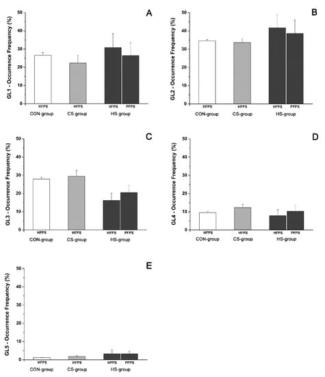 The average muscular activation intervals related to the main three activation modalities for GL are shown in Figure 4 for the HS-group (dark grey bars), the CS-group (light grey bars), and the CON-group (white bars), respectively. For the HS-group, activation intervals are reported separately for the HFPS and PFPS foot-floor contact sequences. The activation intervals are expressed in function of percentage gait cycle. Average occurrence frequencies of muscular recruitment related to all of the detected activation modalities for GL are shown in Figure 5 for the CON-group (white bars), the CS-group (light grey bars), and the HS-group (dark grey bars), respectively. For the HS-group, occurrence frequencies are reported separately for the HFPS and PFPS foot-floor contact sequences. GLi (i = 1–5) are the modality of GL activation with one activation (GL1, Figure 4A), two activations (GL2, Figure 4B), three activations (GL3, Figure 4C), four activations, and five activations (not shown because not statistically relevant) during a single gait cycle. The three groups did not show significant alterations (p > 0.05) in mean activation intervals (Figure 4) among groups and mean occurrence-frequency values (Figure 5) for all of the activation modalities; moreover, the most frequent modality of activation remained the same among groups (2-activation modality, Figure 5B).
