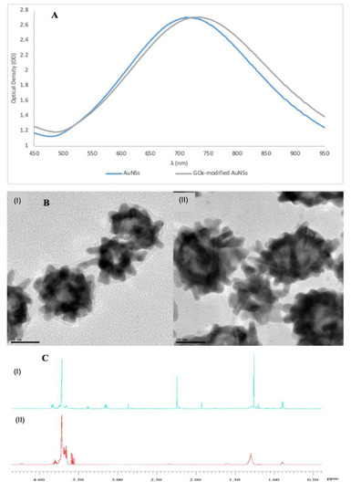 (A) Normalised UV-vis spectra showing a red-shift for the AuNSs modified with 0.042 mmol/L of glucose oxidase (GOx). (B) High resolution transmission electron microscope (HR-TEM) images of (I) polyvinylpyrrolidone (PVP)-stabilised AuNSs, and (II) GOx-modified AuNSs. (C) 1H-NMR spectra of (I) cysteine-modified AuNSs, and GOx-modified AuNSs using cysteine and N-(3-Dimethylaminopropyl)-N′-ethylcarbodiimide hydrochloride (EDC)/sulfo-NHS for bioconjugation. (The images were adapted and used with permission from Phiri et al. [53]).