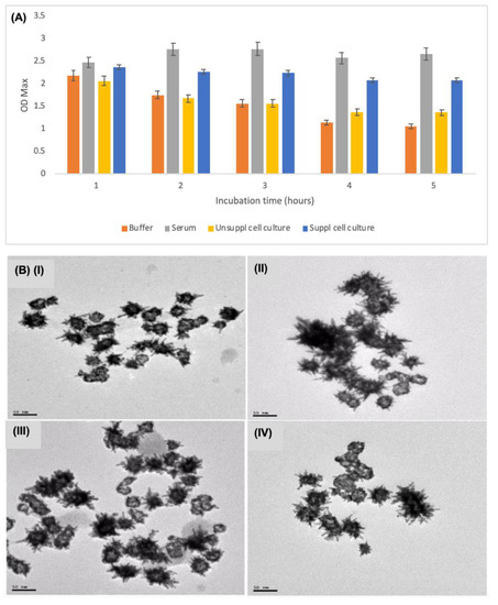 Figure 2A shows the stability of the GOx-modified AuNSs in different media based on change in optical densities over time. The maximum optical density of the bioconjugates in MES buffer and unsupplemented cell culture medium was observed to decline with time due to possible aggregation. However, when incubated in serum the maximum optical density increased in the period between 0–2 h and slightly declined thereafter. The increase in absorption is probably due to the complexation of unspecified serum proteins [43]. The UV-vis spectra of the bioconjugates in serum displayed better stability and only seconded by those incubated in supplemented cell culture medium. The AuNSs in the supplemented cell culture medium showed a steady decline in the UV-vis absorption in the period between 0 to 6 h before stabilising over the remaining hours. This is probably due to the FBS with proteins likely bind to nanoparticles resulting in relative better stability in the media [42,61]. Figure 2B shows the morphologies of the AuNSs–Cys–GOx bioconjugates in the different matrices. The agglomeration of the AuNSs in serum (II) is noteworthy. Agglomeration was observed for these AuNSs compared to those in other matrices. A similar observation was made for AuNSs incubated in FBS-supplemented cell culture medium (IV). The particle agglomeration observed in these two fluids could be attributed to the changes in surface properties brought about by the biomolecules and the ionic strength in the serum that forms a corona around the nanoparticles [41,43,44].