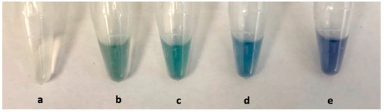 However, when the sample was serially diluted 1000 times, colour changes were observed as shown in Figure 3. The final concentrations of AgNO3 and NH3 in the detection solution were also optimised to a final concentration of 0.25 mM and 20 mM, respectively, to generate visible colour changes. The biosensor showed ability to differentiate between concentrations of glucose at 1000 times dilution. Sample serial dilution of 1:100–1000 was observed to be optimal for the detection of an analyte in the serum using the fabricated nanodevices. Such a great sample dilution factor offers the advantages of reducing the effects of complex sample interferences [23], and allows the quantification of samples whose concentration is very low, and whose volumes are ultra-low. For simplicity’s sake and reducing batch variations in experimentations, a dilution factor of 1:100 was chosen for further experiments that enabled the use of 2 µL of serum in a total reaction mixture of 200 µL.