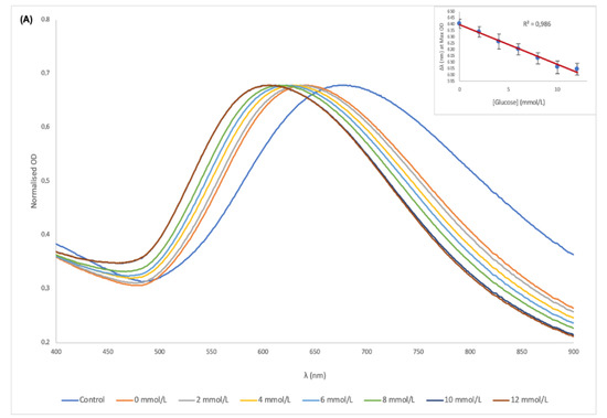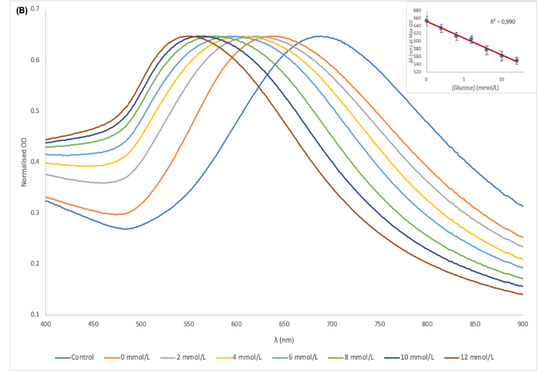 The LSPR peak shifts of AuNSs in serum in Figure 5A showed a total of 80 nm blueshift. In MES solution however, AuNSs showed a clearer and greater shift of 131 nm from the control to the highest glucose concentration as shown in Figure 5B. The reason for this observation in the two sample matrices could be due to the interferences caused by proteins and lipoproteins in the serum, which can affect the analytical performance of the biosensor [40]. When the LSPR peak shifts were plotted against the increasing concentration of glucose as shown in Figure 5A,B inserts, the correlation coefficient (R2) in both serum and MES were 0.99. This represented a predictable detectable range for glucose concentration with a 100 times dilution of the sample.