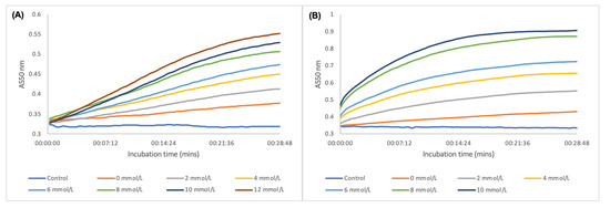 Figure 6A shows the kinetic reaction that was monitored at 550 nm from the start of incubation with all the optimal reaction conditions with different glucose concentrations. As the reaction proceeded, there was a distinct differentiation between the concentrations of glucose based on the absorbance. The biosensor only required an incubation time of <15 min at 37 °C for sufficient oxidation of glucose and to generate distinguishable colours and plasmonic shifts for detection. Figure 6B shows signal generation by addition of detection solution after incubation of the reaction mixture at 37 °C for 45 min. The biosensor was able to generate distinguishable colorimetric and plasmonic signals between the glucose concentrations in serum in less than 10 s of detection solution addition. Within 5 min, the signal generation process was near complete. This demonstrates the rapidity of the biosensor both in incubation time and detection process.