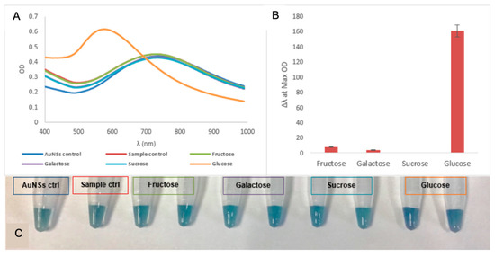 (A) UV-vis spectra of the specificity of the glucose biosensor in the presence of other saccharides at 0.1 mM concentration; (B) corresponding response in terms of Δλ at OD Max for each saccharide for the glucose biosensor; (C) photograph of the change in colour for the various saccharides.