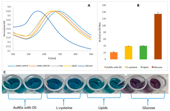 The specificity of the glucose biosensor was investigated by using other saccharides as substrates instead of glucose. Figure 7 displays the signal response of the biosensor to these glucose analogues. No significant colour changes or LSPR peak shifts were observed in the presence of other saccharides. The biosensor however, generated a significant response when glucose was the analyte. This observation demonstrated that the signal generation was strongly dependent on the presence of glucose in the reaction solution, and not any other saccharides. The glucose biosensor demonstrated the ability to distinguish the presence and absence of glucose within the limits of detections in the presence of other structural analogues. Furthermore, when L-cysteine and lipids were used as substrates, as shown in Figure 8A,B, minimal LSPR peak shifts were observed for these analytes except for glucose. Figure 8C shows the colour changes—or lack thereof—of the different analytes. Analytes other than glucose did not produce any change in colour that was significantly different from the blank AuNSs. The biosensor thus demonstrated a specific response for glucose in the presence of potential interferences in serum.