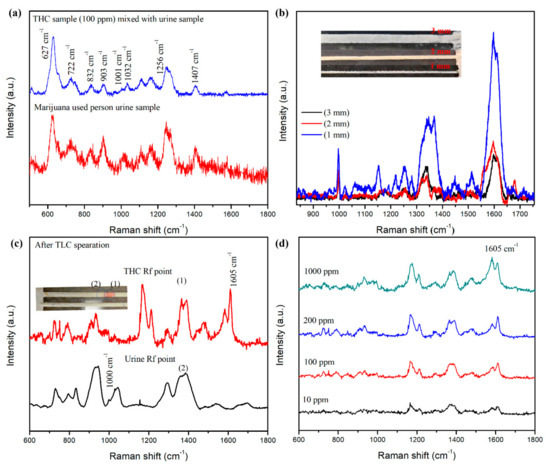 The resulting clear separation of THC in the THC-spiked urine sample is illustrated in the inset in Figure 4c. A quick migration of the THC on the diatomaceous earth TLC plate was observed and can be attributed to the molecular polarity of THC. The obtained retention factor (Rf), which is calculated as the ratio of the distance migrated by the target analyte to the distance migrated by the eluent solvent, was 0.69 and 0.72 cm for the concentrated urea and THC, respectively, which was shown in the inset of Figure 4c. The SERS spectra at two marked positions demonstrated strong SERS characteristic peaks of urea (1) and THC (2), as illustrated in Figure 4c. These results confirmed the THC separation from urine samples using the diatomaceous TLC plate. Next, THC at various concentrations (i.e., 1000 ppm to 10 ppm) was artificially added to urine solutions. Urine samples were collected from non-marijuana using volunteers in the morning. After the separation of THC from these artificially-contaminated urine samples, SERS spectra were measured on the THC spots, according to the Rf value. The strongest SERS peak of THC appeared at 1605 cm−1, as shown in Figure 4d. There are several clear urea Raman peaks at 627, 727, 780, 830, 903, 937, 1000, 1038, 1256, 1293, 1382, and 1407 cm−1 and THC Raman peaks at 722, 785, 932, 1164, 1210, 1367, 1392, 1478, 1582, and 1605 cm−1. Their assigned bands are listed in Table 1. Compared with direct THC SERS sensing from saliva samples, more THC-related Raman peaks were obtained using TLC separation. This indicated a clear separation of THC from complex samples.