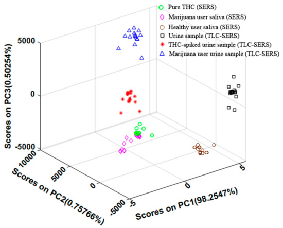 In order to quantitatively evaluate the effectiveness of our portable SERS sensing technique, we used Principal component analysis (PCA), which is a multivariate statistical method for feature extraction, to analyze the samples we measured in our previous studies. PCA was performed using math-works (MATLAB) software based on 20 spectra for each sample type. PCA was applied to six groups of data: SERS spectra without TLC (i.e., pure THC, healthy people’s saliva and marijuana user’s saliva) and with TLC separation (i.e., urine sample, THC-spiked urine sample, and marijuana user’s urine sample), as shown in Figure 6. In this analysis, the first three PCs of the SERS spectra account for PC1 (98.25%), PC2 (0.75%), and PC3 (0.50%) of the variance for the six groups of samples, as displayed in Figure 6. It is very clear that PC1 is the main principle component and should account for the major score. When comparing pure THC (200 ppm) and marijuana users’ saliva samples using the SERS-only sensing method, the PCA plot shows highly congregated clusters arranged in close proximity to each other. The PCA results indicated that saliva samples contained less molecular interference and the results closely matched pure THC solution. After TLC separation, each sample matrix formed a good cluster but slightly spread out along a single plane. The samples containing THC have a similar PC1 score compared to pure THC solution, while the urine samples and healthy people’s saliva without THC are far away from other samples and have a very different PC1 score. This indicates the significant difference of the SERS spectra due to the presence of THC in different biological samples. When comparing THC-spiked urine samples and marijuana user’s urine samples, the latter are further away from the pure THC, which suggests stronger background interference and matches our previous analysis. Therefore, using the PC1 score from the PCA results can effectively evaluate the presence of THC in complex biological samples.