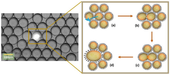 Many lab-on-a-chip (LoC) applications have become possible thanks to the ability to control mixing of different droplet contents, which enabled the sequencing of many complex bio-chemical and biological reactions with a high level of control and flexibility over the last decade; see for a review [1,2,3,4,5,6,7]. Hence, among all manipulation schemes allowed by droplet-based microfluidics technology [8,9,10,11,12,13,14,15,16], active merging of microdroplets (AMD) is probably one of the most important. It is generally achieved using a high alternating current (AC) voltage [17], or using a direct current (DC) voltage [18]. Nevertheless, light-driven merging of droplets is a more attractive approach since light provides not only high temporal and spatial resolutions but also wavelength and intensity tunability [19,20,21].