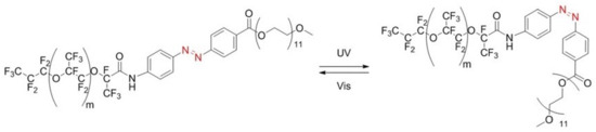 We synthesized a new fluorinated azobenzene derivative surfactant polymer, named in this study KryAz600. It consists of a triblock copolymer surfactant, composed of a perfluoro-polyether (PFPE) hydrophobic chain, linked to a polyethylene-glycol (PEG-600) hydrophilic chain (Sigma-Aldrich, Saint-Quentin Fallavier, France) through an azobenzene group, as shown in Figure 2. The PFPE hydrophobic chain was derived from a commercially available carboxy-terminated fluorinated polymer, namely Krytox 157-FSH (Dupont) and linked to the azobenzene group following a similar procedure as described in detail by Lee et al. [25], see also supporting information at (S1) for details.