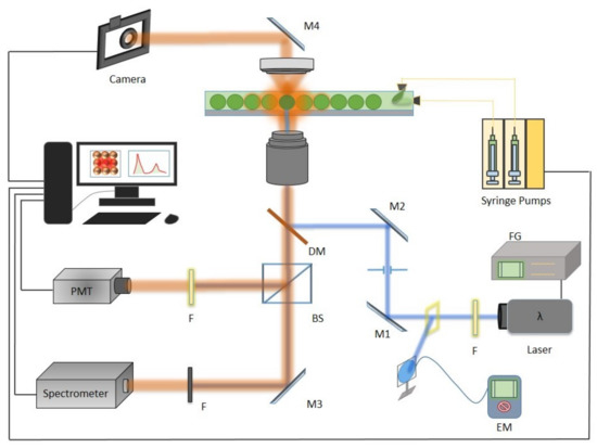 Nemesys syringe pumps (Cetoni GmbH, Korbussen, Germany) were used to fabricate monodisperse drops of size range 50 m to 150 m depending upon the need. To study and sort droplets, the optics part consists of a ps-pulsed UV laser source, with a peak wavelength at 355 nm and delivering 15.4 J of energy per pulse. In order to make the laser spot size adequate, the laser beam was cleaned and band-limited for enhanced detection (20 nm filter F). Figure 3 illustrates the optical path for the laser source. After the filter, the source was staged up and reflected by dichroic mirror (DM) (Tx = 506 nm, Semrock, Rochester, NY, USA) to the sample where a microscope objective (2×, 4×, or 10× Olympus Inverted Microscope) targets and acquires the reflected/scattered signal from the droplet under observation. At the detection side we used a standard speed camera for recording and visual inspection of the droplet generation, manipulation, and merging. For detection, a photo-multiplier tube (Hamamatsu) was used to monitor droplet generation frequency. For optimized 100 m drop-size (500 L/h and 100 L/h for the continuous and dispersed phase), the droplet frequency was found to be about 250 drops/second (scheme for droplet frequency was derived from the method discussed in [15]).