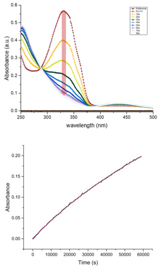 (Upper) Conversion of the surfactant state under UV illumination, Top curve (red) being the first measurement with no UV treatment and subsequent state change transition of surfactant by 10 s of exposure to a UV lamp with power of 6.7 mW at 365 nm wavelength; (Bottom) slow exponential rise of the 335 nm absorption band intensity of the t-KryAz600 form in dark, this corresponds to a half-life h of the c-KryAz600 → t-KryAz600 transition.