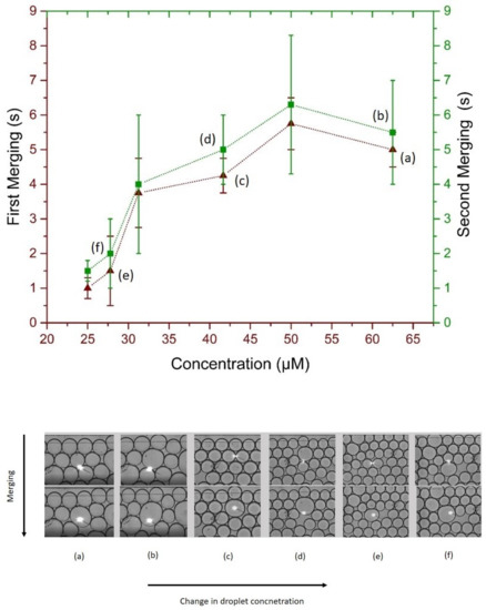 Also, because at the micrometer scale, the diffusion of surfactant molecules cannot be neglected, we found it necessary to investigate the relation between the merging time and the concentration of the surfactant molecules in the carrier fluorocarbon oil. This is particularly important in our study since a focused pulsed laser with a micrometer sized footprint is used for photo-isomerization.