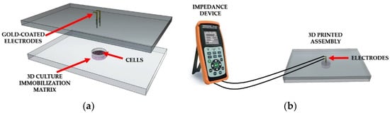 Experimental setup. (a) Representation of the cell chamber filled with 3D cell immobilization matrix; (b) Connection of the LCR meter to the 3D printed well.