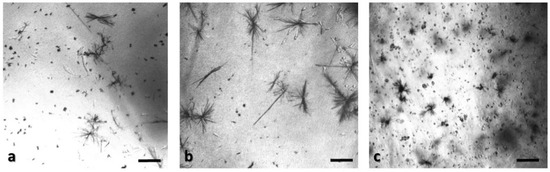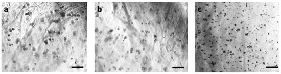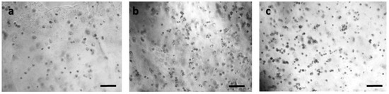 Panoramic view of SK-N-SH immobilized cells in 3D matrix after treatment with MTT for 24 h, showing the viability in three different population densities: (a) 50,000 cells; (b) 100,000 cells; and (c) 200,000 cells. Scale bars = 50 μm.