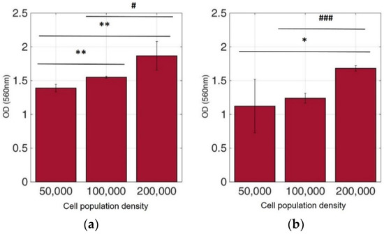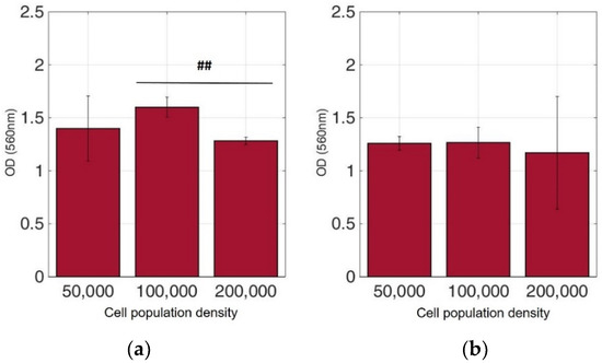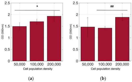 Cellular viability of HEK293 cells immobilized in 3D matrix after treatment with MTT for 24 h showing the viability in three different population densities (50,000, 100,000, and 200,000 cells/100 μL) ± STD: (a) untreated cells (control); (b) cells treated with 5-FU. * < 0.05 significantly different from 50,000 cells, ## < 0.01 significantly different from 100,000 cells/100 μL.