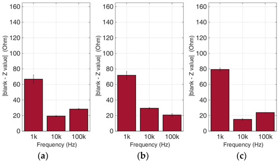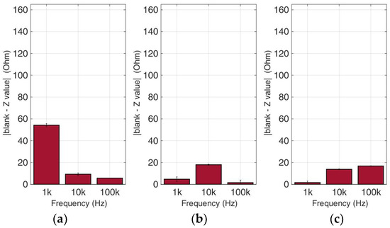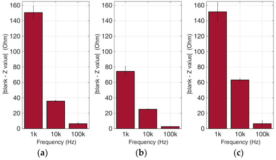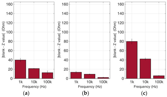 Normalized values of the mean impedance magnitude for untreated (control) immobilized HEK293 cancer cell lines tested at three frequencies (1 KHz, 10 KHz, 100 KHz) for three different population densities ± STD: (a) 50,000 cells; (b) 100,000 cells and (c) 200,000 cells/100 μL.