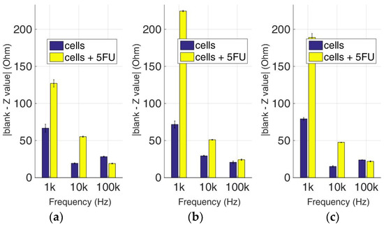 Normalized values of the mean impedance magnitude for control immobilized MCF-7 cells (blue bars) and immobilized MCF-7 cells treated with 5-FU (yellow bars), tested at three different cell population densities ± STD: (a) 50,000; (b) 100,000 and (c) 200,000/100 μL for three different frequencies (1 KHz, 10 KHz, and 100 KHz).