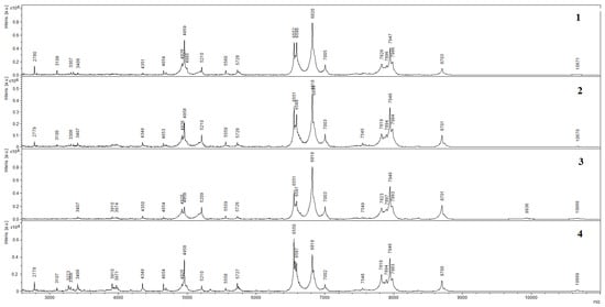 MALDI–TOF mass spectra: G. oxydans (1); G. oxydans/MWCNTs/chitosan (2); G. oxydans/chitosan (3); G. oxydans/MWCNTs (4).