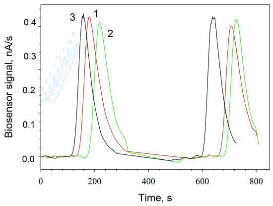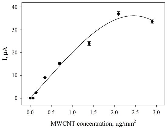 The presence of MWCNTs in a biosensor’s composite leads to a decrease in the electrode’s impedance. Correspondingly, the addition of MWCNTs to the composite applied to the surface of a screen-printed electrode results in the increase of anodic and cathodic peak currents on cyclic voltammograms. The increase in anodic currents depends on the content of MWCNTs in the composite (Figure 6). A MWCNTs concentration of 2.1 μg/mm2 was used in further experiments to achieve the best possible electrochemical properties of the microbial biosensors.