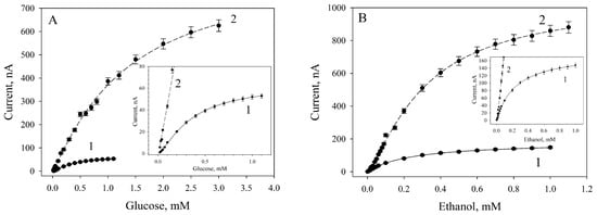 Calibration curves for glucose (A) and ethanol (B) analysis with the values averaged from three consecutive calibrations of a biosensor based on G. oxydans/chitosan (1) and G. oxydans/MWCNT/chitosan (2) composites. Insets show zoomed-in sections of low-current regions of the graphs.