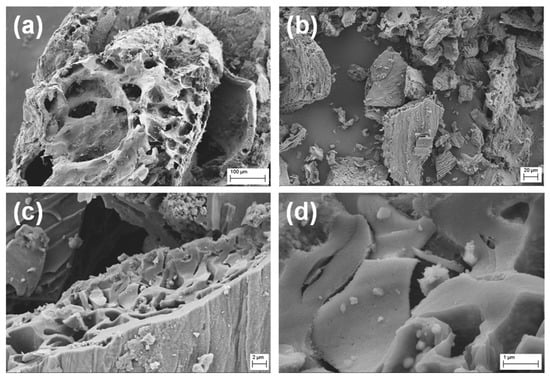 Figure 2b underlines that biochar powder was composed of irregularly shaped, significantly amorphous and heterogeneous macro- and micro-particles with sponge-like structures, characterized by the presence of several pores of different sizes and many hollow channels (average diameters around 10–20 µm), even if little defined, uneven, and not uniform (Figure 2a). It is possible to observe very coarse, heterogeneous and plane cleavage surfaces, due to the pyrolysis process that is able to stabilize the volatile hydrocarbons, smoothening the biochar surface, and broken edges with tarry deposits on the surface. The vesicles on the biochar surface resulted from the gradual release of different volatile compounds formed in the softened biomass matrix during the pyrolysis process through a melt phase of cellular components (Figure 2c,d) [25,26,27,28].