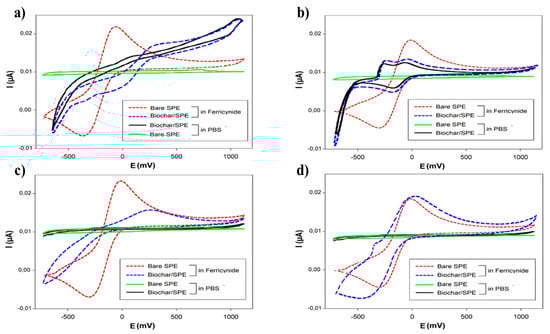 Cyclic voltammograms of bare screen printed electrodes (SPEs) and biochar/SPEs sensors obtained with dispersion of (a) DMF:H2O (1:1 v/v), (b) DMF, (c) NMP, or (d) ethanol. Measurement conditions: scan rate 30 mVs−1.