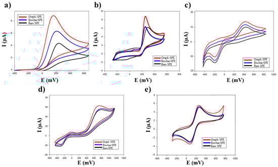 Cyclic Voltammograms of biochar based, graphene based, and bare SPE sensors obtained with: (a) 20 mM ascorbic acid, (b) 20 mM uric acid, (c) 20 mM benzoquinone, (d) 20 mM epinephrine, and (e) 20 mM ferricyanide in 50 mM phosphate buffer + 10 mM KCl, pH 7.4; scan rate 30 mVs−1.