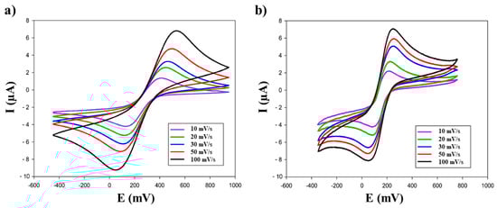 Scan rate study: comparison of cyclic voltammograms obtained with (a) biochar/SPEs and (b) graphene/SPEs sensors using 10 mM ferricyanide in 50 mM phosphate buffer + 10 mM KCl, pH 7.4.