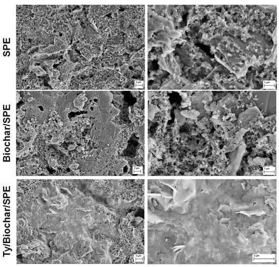 SEM micrographs of bare SPE, biochar/SPE and Ty/biochar/SPE.